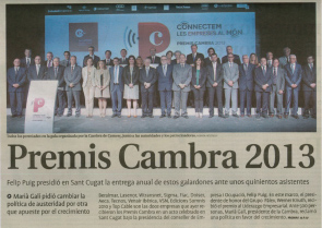 El pasado 20 de Junio tuvo lugar el acto de entrega de los Premios CAMBRA 2013 en la masía Can Magí de St. Cugat. El acto tuvo como anfitriones la alcaldesa de Sant Cugat, Sra. Mercè Conesa, y el Presidente de la Cámara de Terrassa, Sr. Marià Galí, y contaron con la destacada presencia del Consejero de Empresa y Empleo del Gobierno catalán, Sr. Felip Puig, y el Presidente de la Cámara de Barcelona, Sr. Miquel Valls, además de como es habitual una nutrida presencia empresarial, política y social de la demarcación.